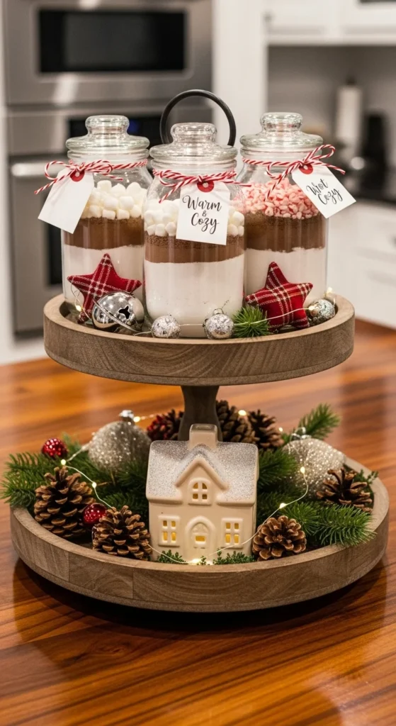 Tiered trays are perfect for festive vignettes. Layer holiday decor items like mugs, faux snow, and ornaments. Add hot cocoa jars or cookies for practicality. You can switch themes weekly — from gingerbread to peppermint. This idea keeps your kitchen festive and functional at the same time.