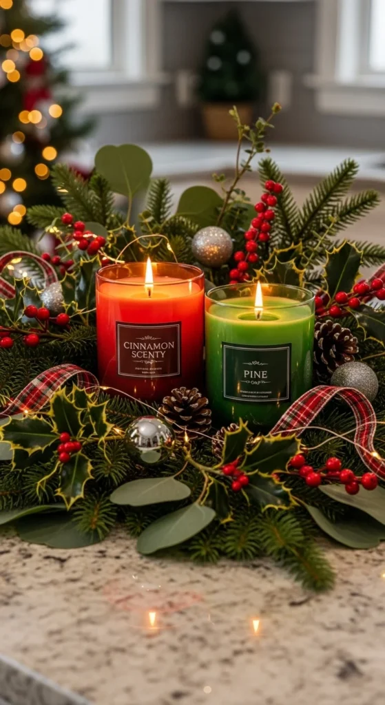 Bring the holiday spirit through scent. Place cinnamon, pine, or vanilla candles around your kitchen. Choose jars that match your decor — clear glass for minimalists or red tins for a festive feel. Light them during meal prep for a cozy ambiance. It’s an easy way to create a warm, cheerful environment.