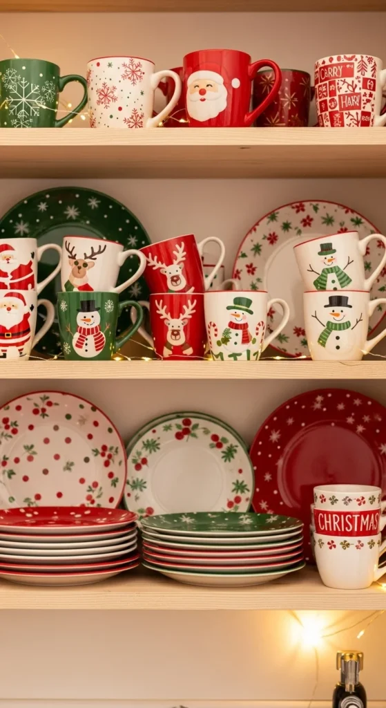 Show off your holiday mugs like artwork. Stack them neatly on open shelves or hang them from hooks. Mix patterns — snowflakes, Santa faces, or reindeer motifs. Add twinkle lights to highlight the display. It’s functional, fun, and turns your kitchenware into part of the decor.