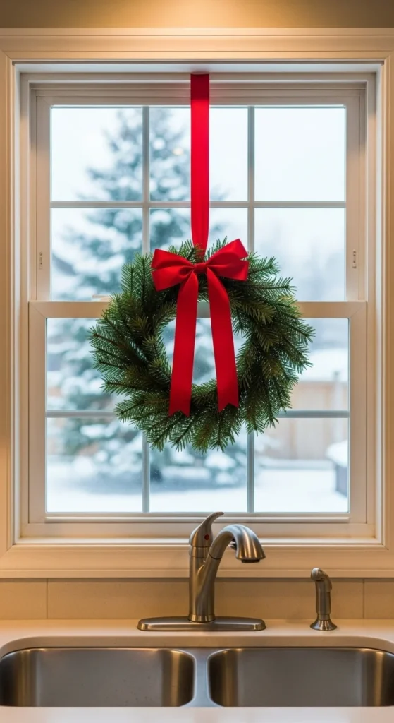 Add a wreath above your kitchen sink for subtle charm. Use command hooks for easy hanging. Choose one with berries or mini ornaments for color. Each time you glance up while washing dishes, it’ll bring a smile. Simple, classic, and perfect for smaller kitchens.