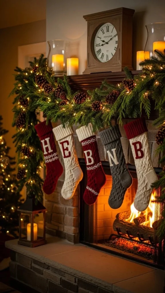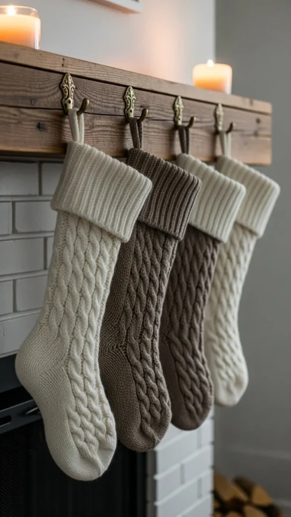 Cable-knit stockings bring a soft, inviting texture to your mantel. Stick to neutral shades for a soothing palette that works with any room. Brass hooks add a touch of warmth without feeling overpowering. You can DIY these by repurposing old sweaters—just stitch the opening and add a loop. Keep the mantel simple so the knit pattern shines. This setup works beautifully if you love a calm winter look.