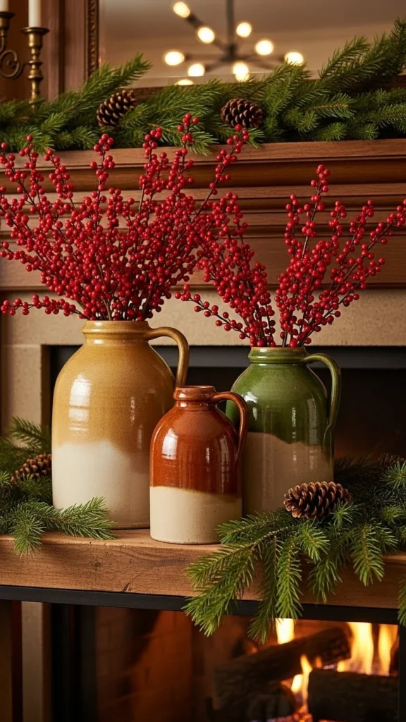 Red berry branches bring instant Christmas cheer without overwhelming the mantel. Stoneware jugs create a rustic foundation. Add a few pine sprigs for balance. This setup works beautifully when you want a pop of color but still prefer a simple arrangement. You can find faux berry stems at discount stores and mix them with real greenery for texture. Spread the jugs out evenly to keep the look calm.