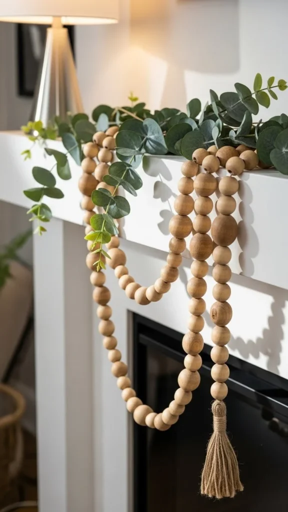 Wooden bead garlands bring natural charm to your mantel. Keep the beads natural or whitewashed for a soft holiday feel. Combine with eucalyptus stems for added texture. This works well if you enjoy DIY because you can string your own beads inexpensively. The look is clean, calming, and easy to pair with almost any other decor. Add a single focal piece—like a framed print—to complete the setup.