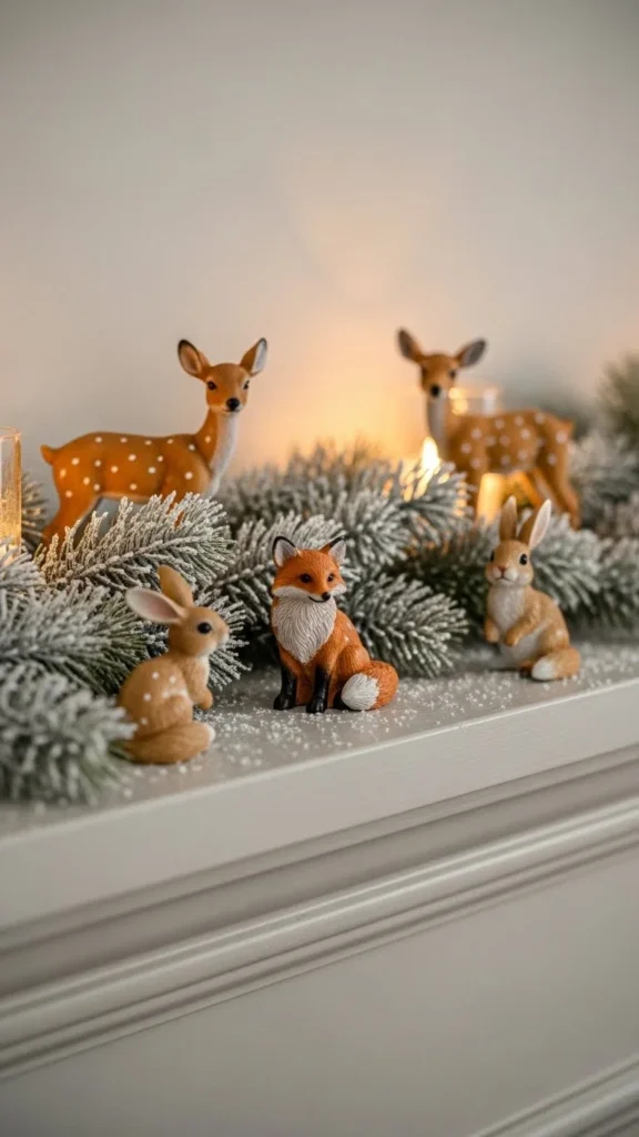 Woodland figurines bring a touch of whimsy. Choose neutral or wooden animals for a calm palette. Add faux snow and pine branches to create a soft winter scene. This idea works especially well in family rooms where kids enjoy seasonal displays. Keep the arrangement simple so each figurine stands out. Combine with warm lighting to create a gentle glow that makes the space feel charming.