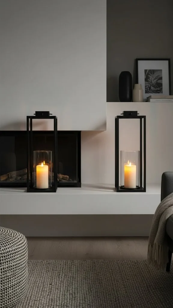 Black metal lanterns bring structure and contrast. Their clean lines help anchor the mantel visually. Add warm LED candles for a comfortable glow that lasts all evening. Keep the arrangement minimal—your goal is calm contrast, not clutter. You can thrift old lanterns and spray-paint them black for a more affordable version. Pair with greenery for a softened look that still feels modern.