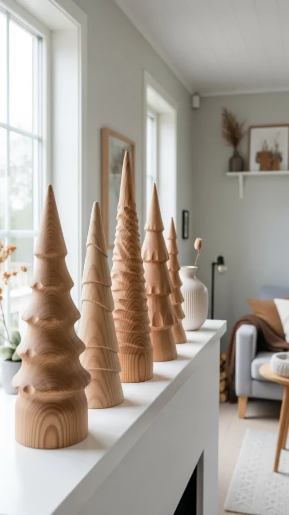 Wooden trees give your mantel a natural Scandinavian touch. Mix sizes and shapes for interest. Keep the colors light—maple, birch, or whitewashed finishes. Add a few sprigs of greenery behind them for softness. This setup stays calm and organic while still feeling festive. If you enjoy crafting, you can cut simple tree shapes from wood or cardboard and paint them in soft tones.