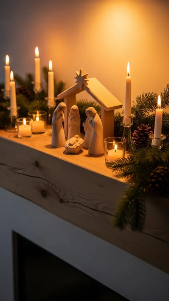 A nativity scene brings a peaceful holiday focus. Choose a neutral-toned set to keep the display calm. Add subtle greenery around the figures for texture. Soft lighting makes the scene feel warm and reflective. If you’re decorating on a budget, mix handmade pieces with small thrifted figurines. Keep the arrangement uncluttered so the figures remain the center of attention.