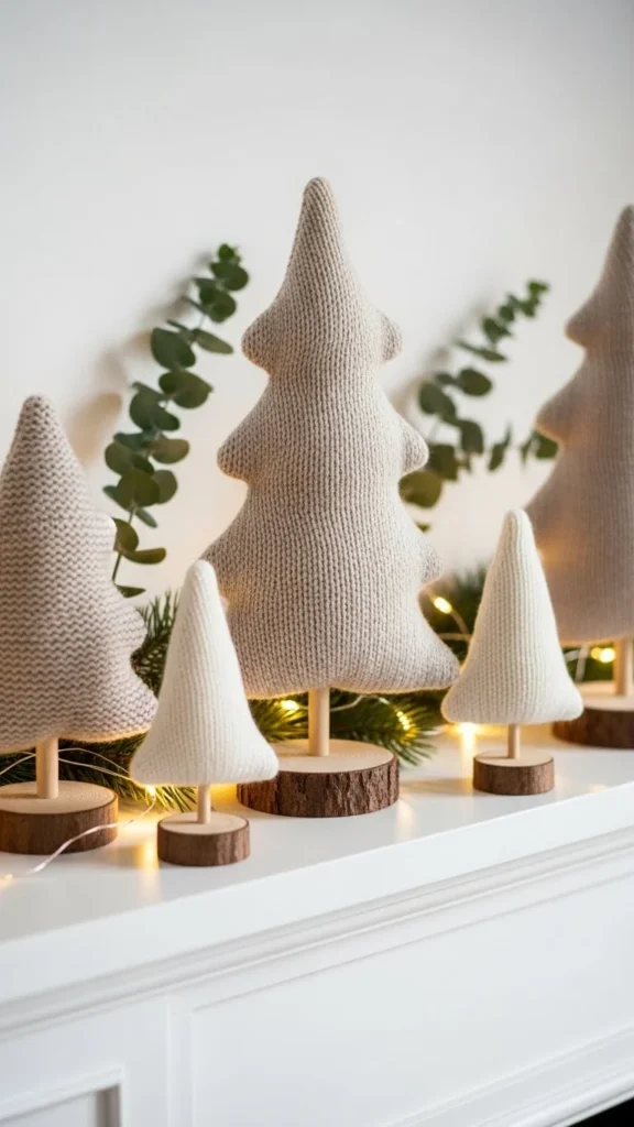 Knit trees bring gentle texture to your mantel and instantly make the space feel warm. Stick to cream or beige yarn so the look stays calm and inviting. These can be made at home using yarn-wrapped cones and simple wooden slices for the base. Add a bit of greenery behind the trees to soften the shapes. The result is a quiet winter scene that pairs beautifully with candles or soft fairy lights.