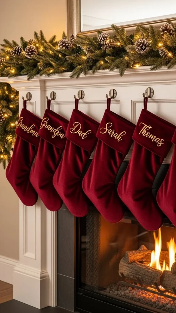 Velvet stockings add richness without overwhelming your decor. Burgundy feels classic and warm, especially when paired with gold hardware. This combination brings a soft holiday glow to the fireplace. You can sew the stockings from leftover velvet fabric if you prefer a DIY approach. Keep the garland above simple so the stockings remain the focal point. This look works beautifully in both modern and traditional homes.