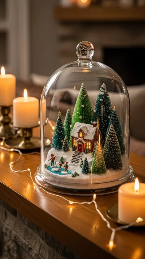 A glass cloche creates a tiny Christmas world that feels magical without taking up much space. Add a small tree, a miniature house, and a sprinkle of faux snow for a peaceful winter moment. This style works well if your mantel is narrow or already decorated with greenery. Use battery lights under the cloche for subtle nighttime glow. It’s an easy way to bring charm while keeping the space clean and relaxing.