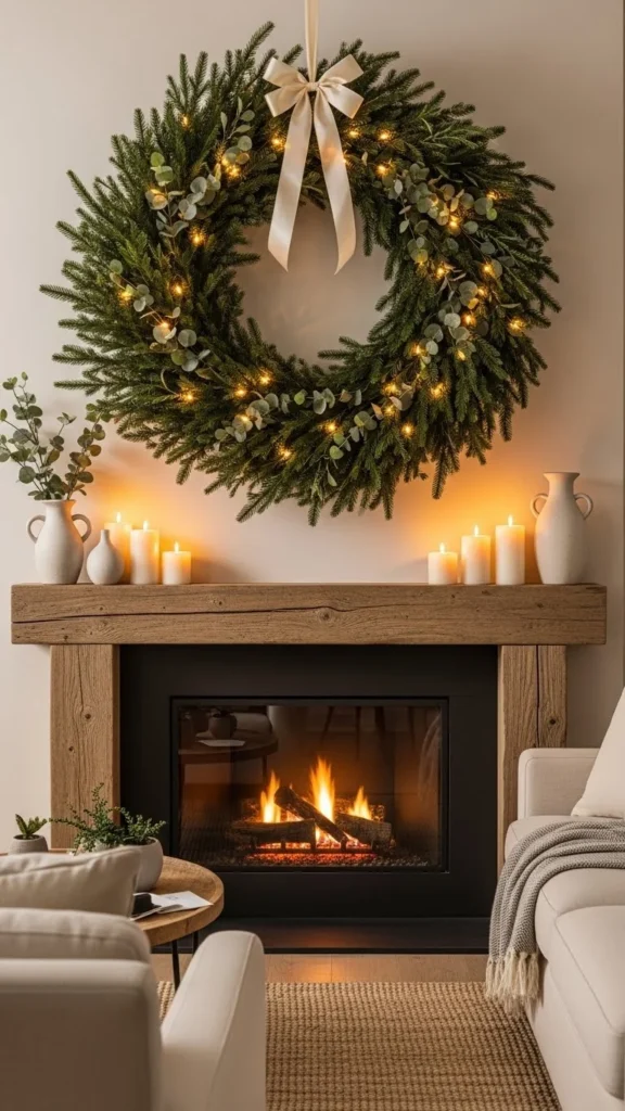 A hanging wreath instantly creates a focal point above the fireplace. Choose a full evergreen base and soften it with eucalyptus for movement and texture. A cream ribbon adds a gentle, elegant touch. Keep the mantel decor below simple—candles or a small garland work well. This setup draws the eye upward and makes the whole room feel soothing and holiday-ready. It’s one of the easiest ways to create a warm Christmas moment.