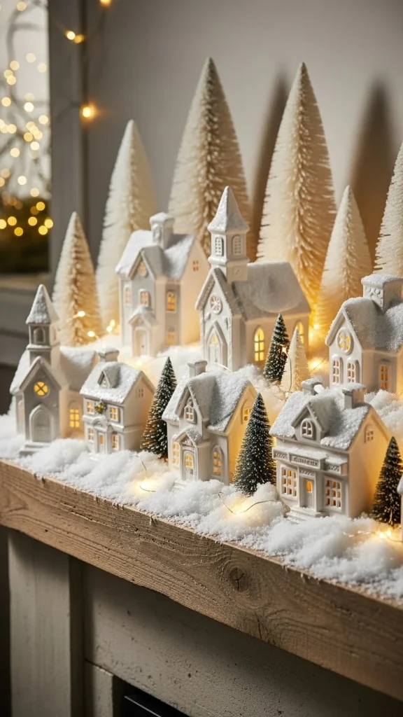 A ceramic village display creates a dreamy little world right above your fireplace. Stick to all-white houses for a clean, timeless setup. Add bottle-brush trees in muted greens for texture. A thin layer of faux snow ties everything together. Use battery-powered tea lights inside the houses for a gentle evening glow. Try mixing house heights for visual interest while keeping the palette soft and comforting.