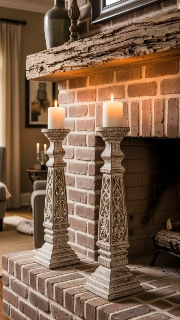 Tall wood candle holders add height and warmth without overpowering the space. Use mismatched sizes to keep the arrangement relaxed. Choose white pillar candles so the focus stays on texture and shape. Add a few sprigs of pine for a touch of holiday charm. If you want a budget option, repaint thrift-store candle holders in a matte wood-tone shade. This style pairs beautifully with cozy farmhouse decor.
