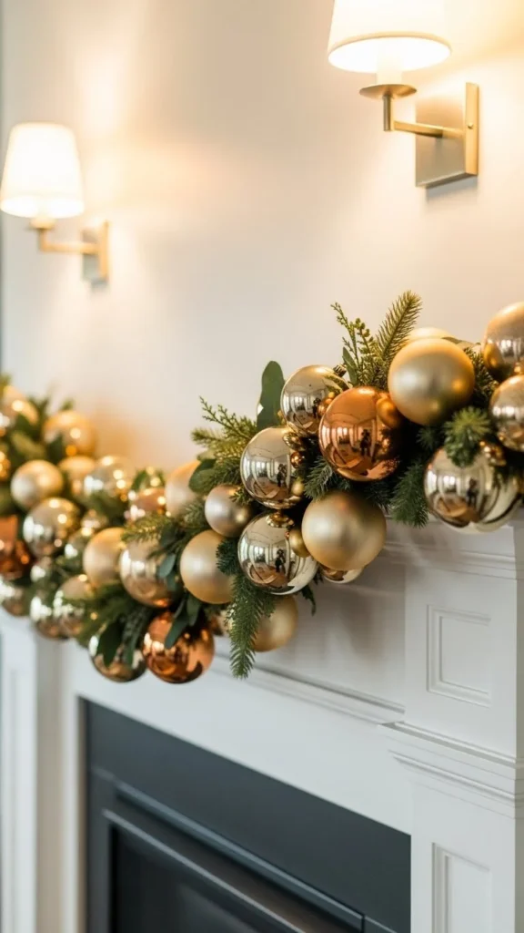 Metallic ornaments bring shimmer without feeling loud. Choose warm tones—champagne, bronze, and gold—to keep the mantel glowing. Add small greenery branches between ornaments for a grounded look. This works well if your room already has metallic accents like mirrors or candleholders. For a thrifty approach, spray-paint old ornaments in matching tones. Keep everything low-profile so the ornaments catch light naturally.