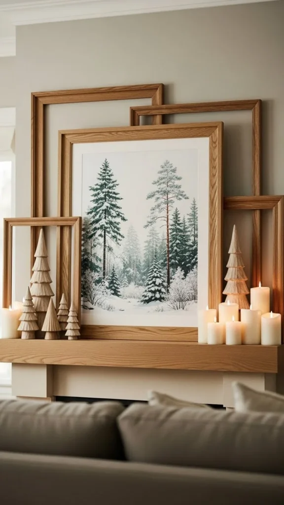 Layering frames gives your mantel dimension without making it feel crowded. Mix wood tones for a relaxed look. Center a winter forest print to tie in the season. Add a few candles or small ceramic trees around the frames for balance. Swap in seasonal art prints you can download and print at home. This creates a polished setup that still feels warm and approachable.