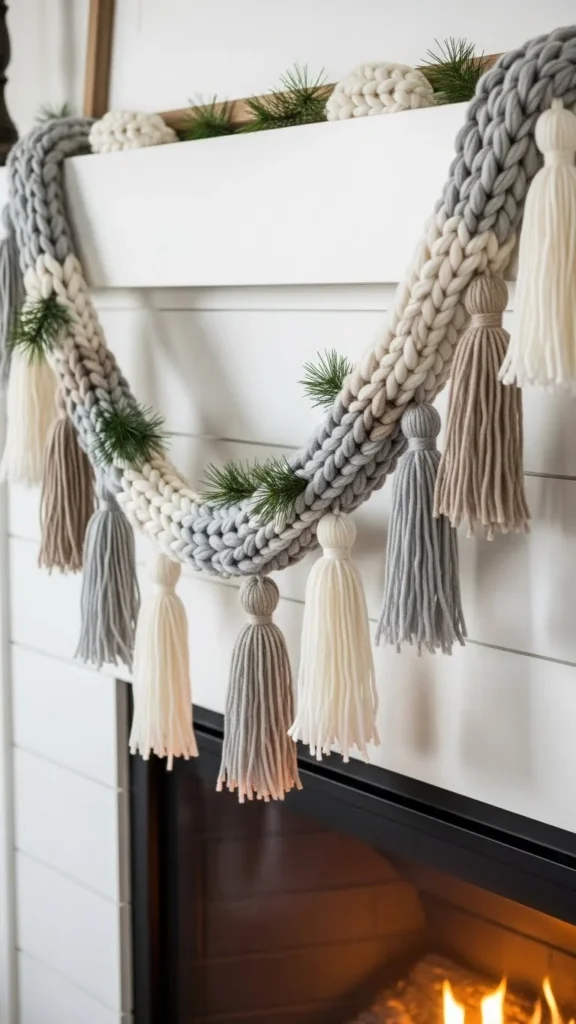 A knit garland brings softness and a handmade touch to your mantel. Choose neutral yarn colors to keep it soothing. Tassels add movement and interest. You can easily DIY this using thick yarn and simple knotting techniques. Add small pine pieces to bridge the handmade look with Christmas greenery. This style works especially well with cozy blankets and soft lighting in the room.