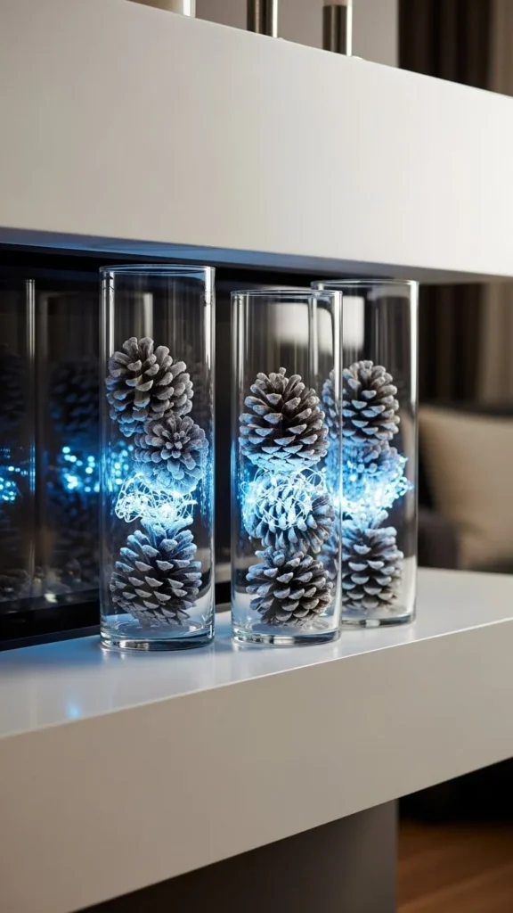 Frosted pinecones add a simple but charming winter touch. Gather real pinecones and spray lightly with white paint for a frosted effect. Display them inside clear glass vases or jars for a clean, modern arrangement. Group vases by height for balance. Add a few cool-toned fairy lights behind them for gentle sparkle. This idea is perfect if you want something low-cost but still visually appealing.