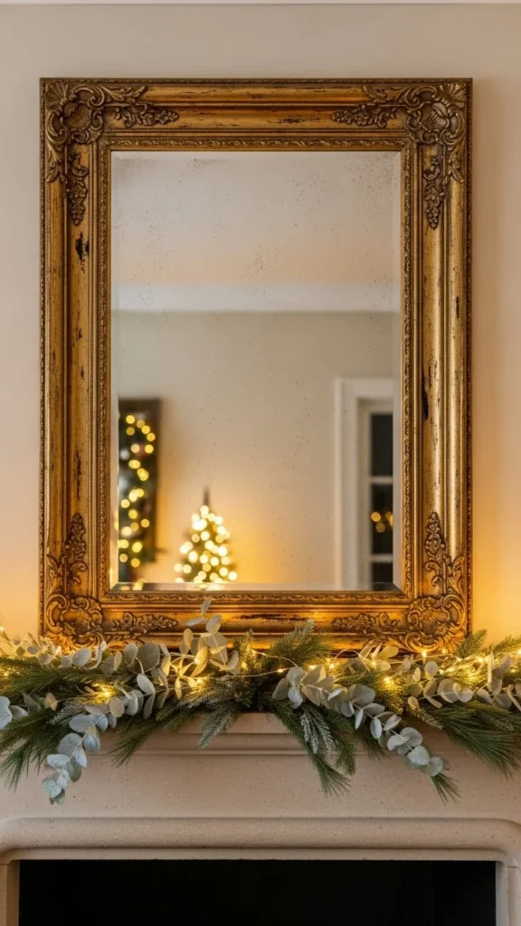 An antique-style mirror instantly adds warmth. Surround it with soft eucalyptus and pine to soften the gold. This creates a soothing contrast between aged finishes and fresh greenery. If you’re working on a tight budget, thrift-store mirrors can be transformed with gold spray paint. Add candles underneath so the mirror doubles the glow and makes the room feel inviting and warm.