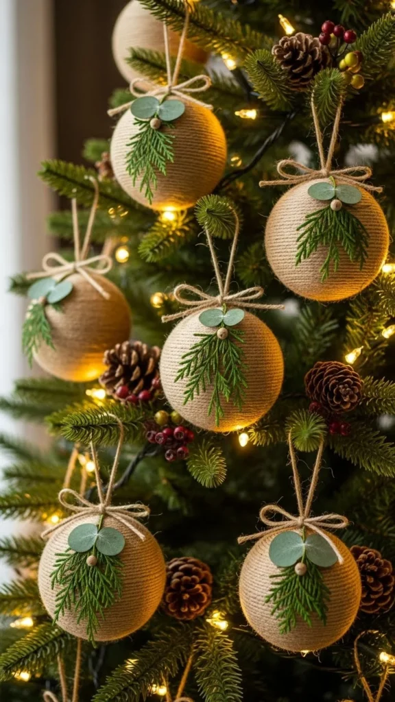 Twine ornaments feel rustic and warm. Wrap clear ornaments or foam balls tightly with twine until fully covered. Add a small pine sprig or tiny berries for a seasonal accent. They blend perfectly with woodland, farmhouse, or neutral Christmas themes. These ornaments also look great in bowls as decor around the home. Inexpensive and simple, they’re a go-to handmade project.