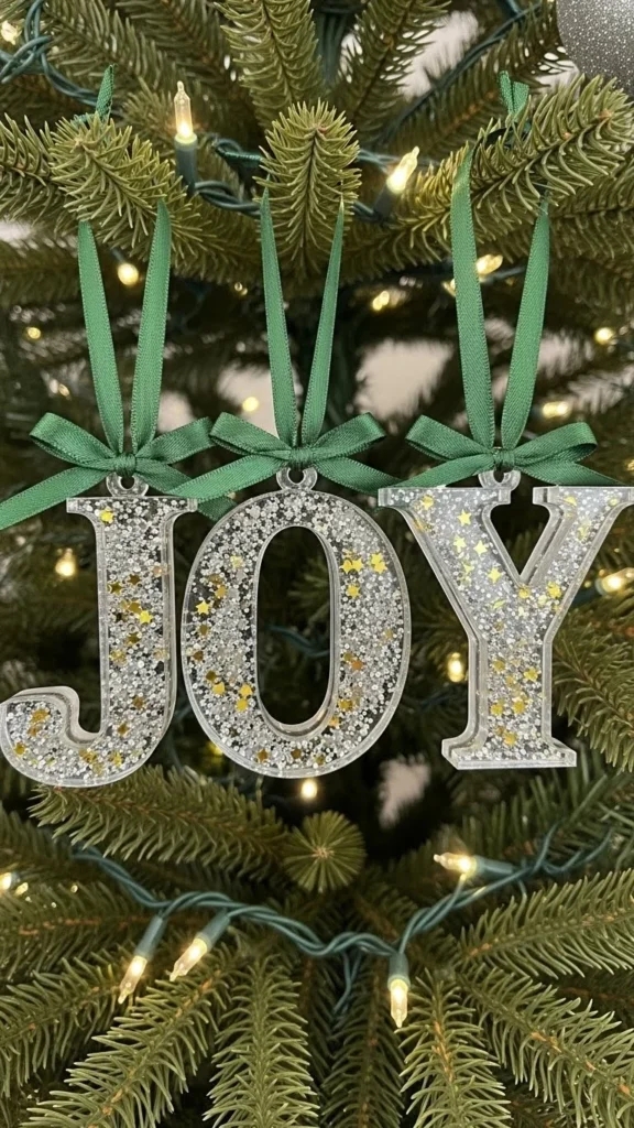 Resin initials feel personalized and glamorous. Use silicone letter molds and add glitter or tiny charms. Let them cure fully before adding ribbon. Families can make one for each member, turning the tree into a personalized display. These ornaments also make thoughtful gifts for friends or coworkers. They’re sturdy, shiny, and full of holiday sparkle.