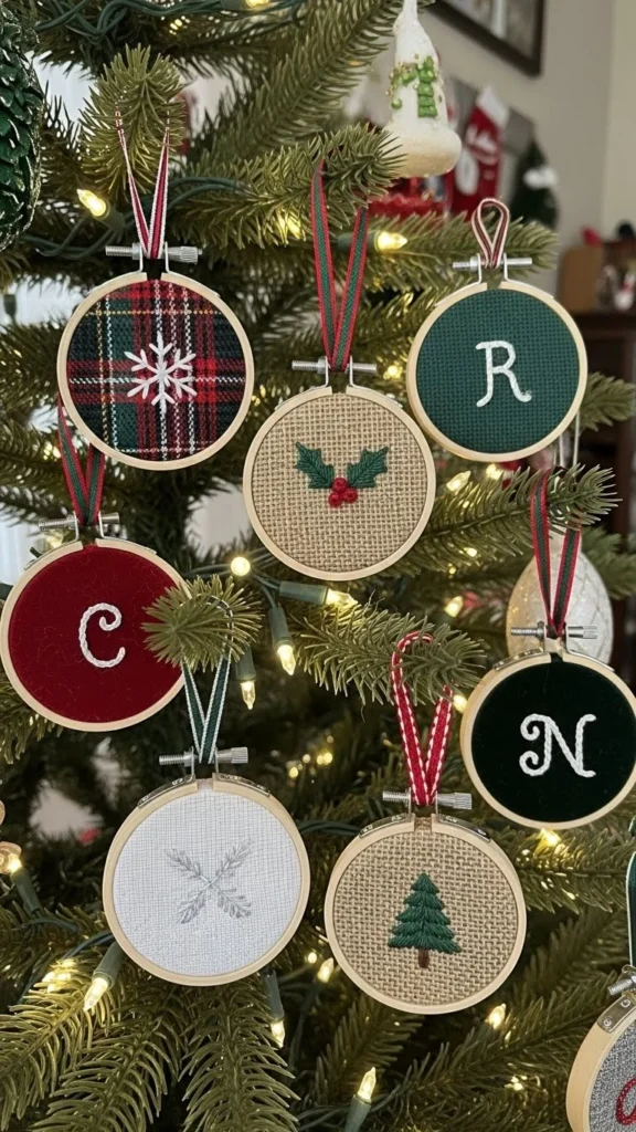 Mini embroidery hoops make charming ornaments. Stretch festive fabric inside the hoop and stitch a small design—snowflakes, stars, initials. Trim the edges and add ribbon. They bring a handmade, nostalgic feel to the tree. You can create a whole collection in one afternoon. These are perfect gifts, too.