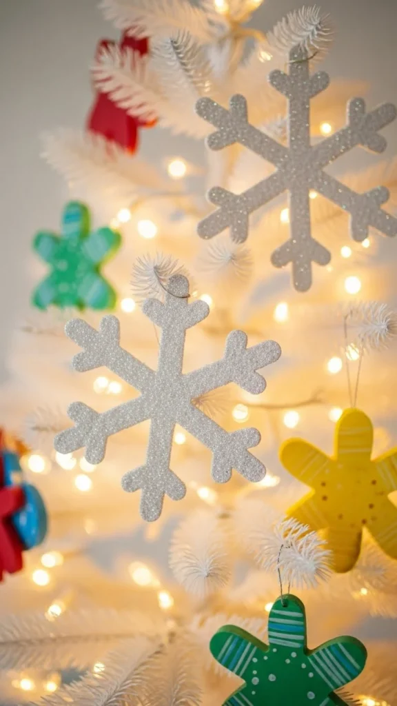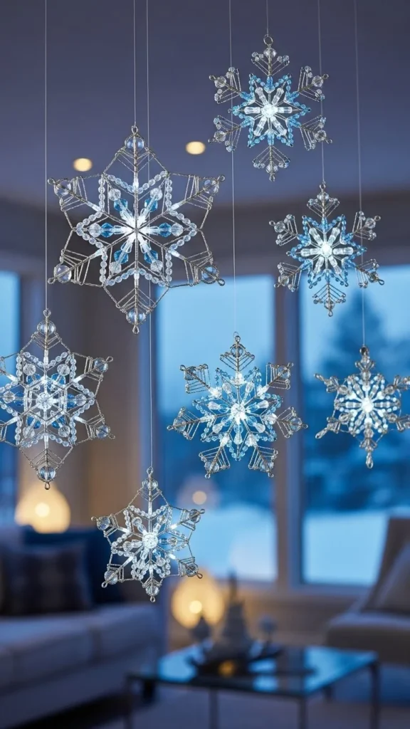 Beaded snowflakes create sparkle without overwhelming the tree. Use craft wire to twist into a snowflake shape, then slide beads onto the arms. They catch the lights beautifully. Kids can help choose bead colors. These ornaments pair well with silver, icy, or minimalist themes. They store nicely and last for years.