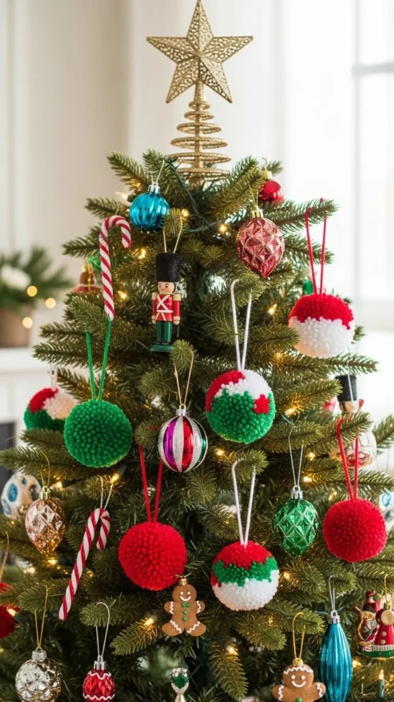 Pom-poms add playful charm. Make them using yarn wrapped around cardboard or use a pom-pom maker. Add a loop and you’re done. These ornaments work great for kids’ trees, playrooms, or cheerful holiday themes. You can also create matching garlands. The soft texture feels fun and cozy.