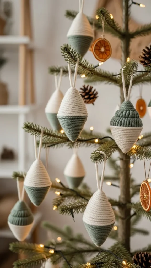 Yarn-wrapped tree cones look soft and cozy. Use foam or cardboard cones as the base. Wrap tightly with yarn and secure the ends. Add little pom-poms or tiny charms for detail. These ornaments suit neutral, cottage, or minimalist holiday themes. They’re simple and can be made in many color palettes.