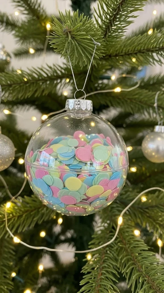 Clear ornaments are perfect for customizing. Fill them with confetti, mini pom-poms, ribbons, or even tiny handwritten wishes. The lightweight materials keep them simple to handle. This is a great activity for kids because they can choose their own colors and patterns. These colorful ornaments add a playful touch to modern trees. Make several for a matching set or create each one with a different look.