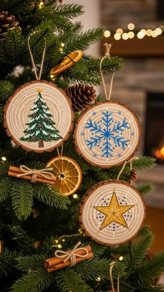 Wood slices are perfect for painting simple holiday motifs. Drill a small hole and add twine. Paint minimal designs or customize them with names. These ornaments look earthy and natural. They work beautifully with rustic or farmhouse decor. Plus, they’re inexpensive to make in large sets.