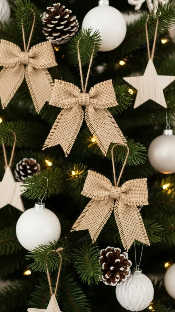 Burlap bows bring a natural, earthy feel to your tree. Cut ribbon into small strips, tie into bows, and secure the center with twine. Add a loop for hanging. These look beautiful on farmhouse, woodland, or neutral holiday trees. They’re extremely inexpensive to make, especially if you already have ribbon on hand. Add small pine sprigs or bells to customize each bow and bring gentle texture to the branches.