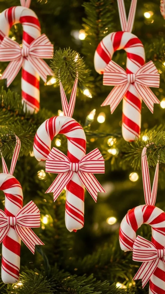 25. Ribbon-Wrapped Candy Cane Ornaments