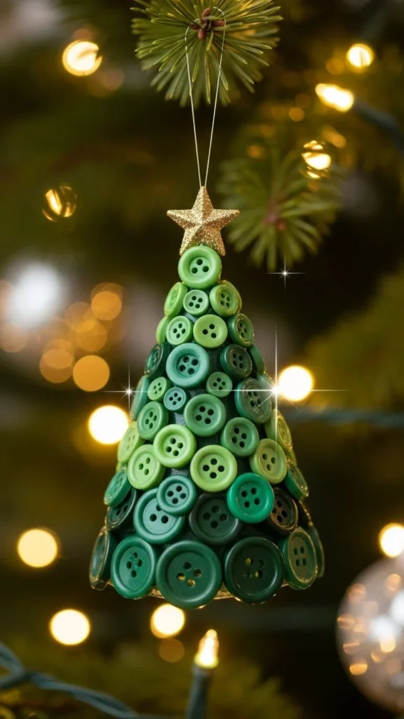 Button ornaments add playful texture. Stack green buttons from large to small on a thin wire or skewer to form a tree shape. Add a star at the top and a loop for hanging. These ornaments look adorable on colorful or family-friendly trees. They’re also a great way to reuse old buttons from sewing kits. Kids love making them because the process feels like stacking beads.