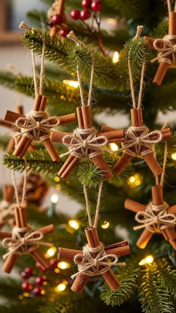 Cinnamon stick stars bring fragrance and texture to your Christmas tree. Arrange five cinnamon sticks in a star shape and secure with twine. Add a hanging loop at the top. These look stunning on rustic or farmhouse-style trees. The natural scent adds another layer of holiday spirit. If you want variation, tie a tiny piece of greenery or a bell in the center. These ornaments feel personal and homemade.