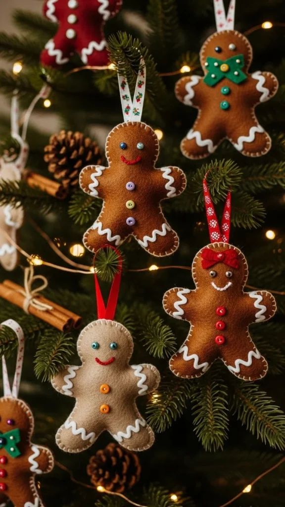 Felt gingerbread ornaments feel charming and nostalgic. Cut two matching shapes from brown felt, stitch around the edges, and add bead buttons or white embroidery. Stuff lightly with cotton for volume. These tiny characters look adorable on any tree. Involve the kids by letting them choose the decorations. You can make a whole gingerbread family collection that becomes a long-term tradition.