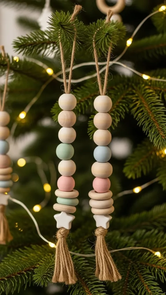 Wooden bead ornaments suit both modern and rustic trees. Paint the beads in soft tones or leave them natural for a minimalist look. String them in patterns—large to small, alternating colors, or shapes. These ornaments feel calm and stylish, perfect for Scandinavian Christmas decor. They’re easy to customize and inexpensive to make in batches. Add a satin ribbon for a soft touch.