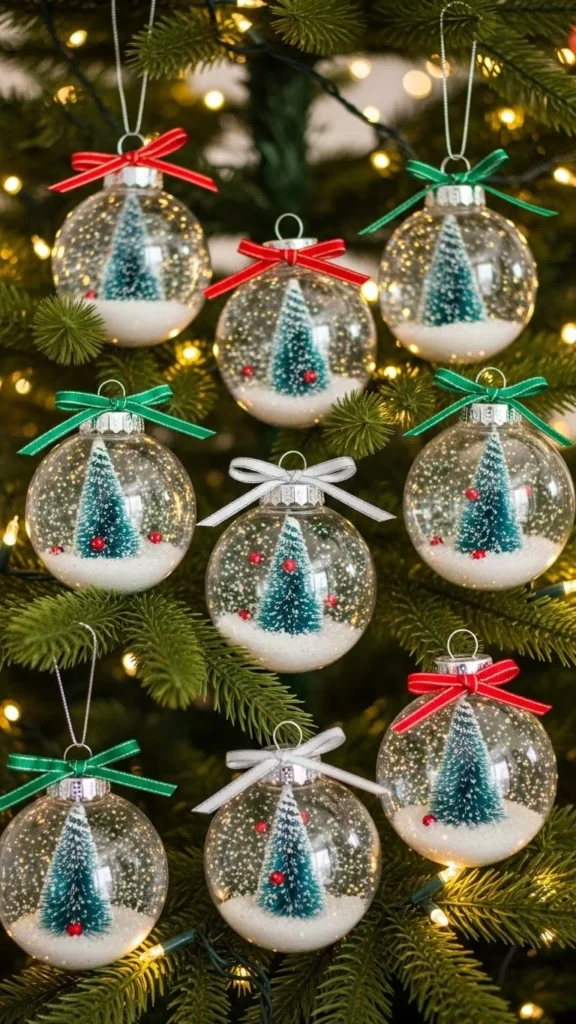 Mini snowglobes bring magic to your tree. Add a tiny bottle-brush tree inside the ornament, sprinkle faux snow, and close securely. Shake gently to test. These little decorations shimmer beautifully under tree lights. Kids love watching the “snow” swirl around. You can personalize them by adding tiny figurines or handwritten messages. They’re charming keepsakes that stay fun year after year.