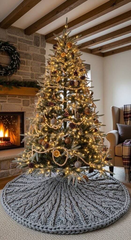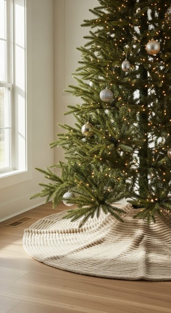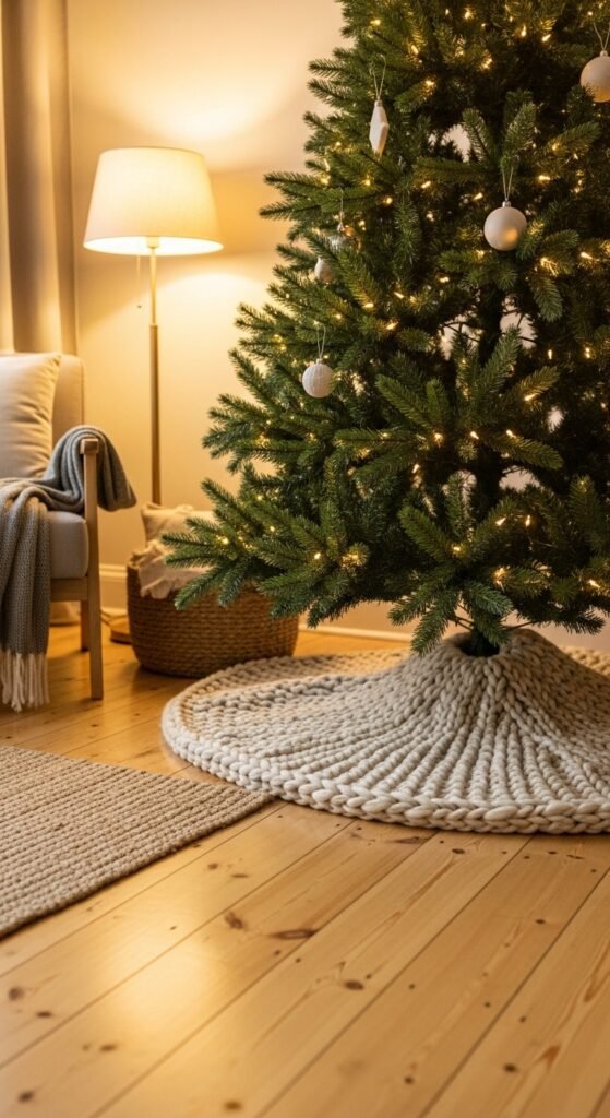Repurposing sweater fabric makes for a charming tree skirt with character. Cable-knit textures instantly create warmth around your tree. You can make one by stitching together panels from old sweaters. This style looks great with neutral ornaments, wooden accents, and cozy decor. Keep the palette simple so the texture can shine. Add a few small baskets nearby for a snug holiday look. Sweater skirts work wonderfully in winter-themed homes and bring soft comfort to your festive space.