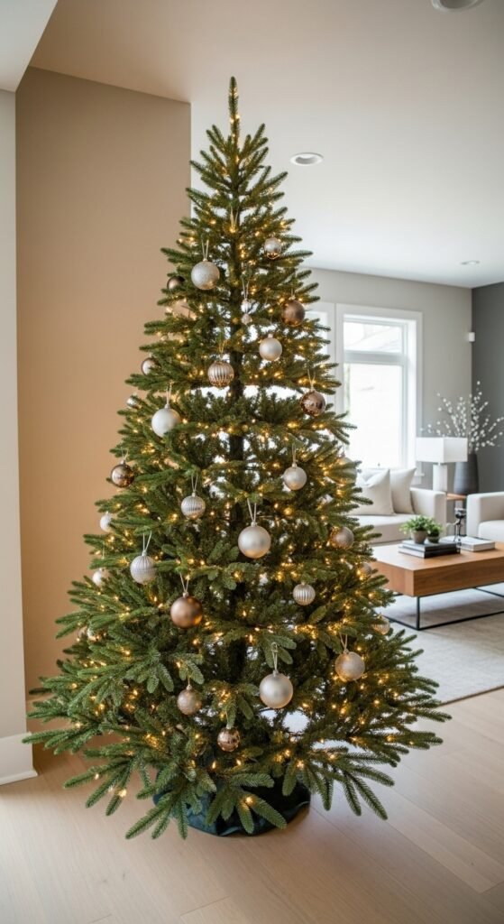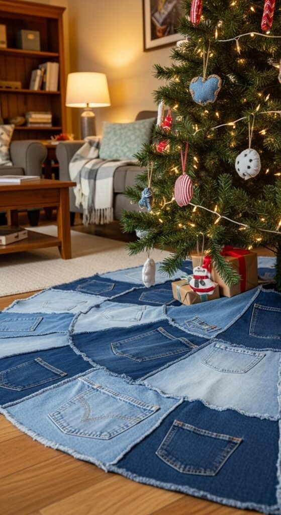 A denim skirt offers a laid-back, meaningful touch—especially if you use old jeans from family members. Mix different shades of blue for variety. Add contrasting stitching for style. Denim holds shape well and looks great with casual decor. Pair it with wooden ornaments, soft lights, and simple garlands. This style also works well with kraft-wrapped gifts. The relaxed charm makes the tree feel approachable, warm, and full of personality.