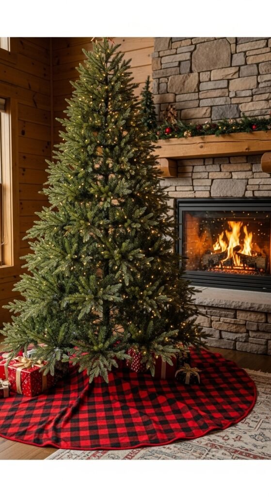 Flannel adds warmth and comfort to your tree space. Buffalo plaid is bold yet welcoming, making it ideal for cabins or farmhouse-style rooms. Choose a thick flannel so it lays nicely. You can finish the edges with solid black trim for structure. This style pairs well with wood ornaments, antlers, pine cones, or rustic garlands. Keep gifts wrapped in kraft paper to stay consistent. Flannel skirts bring a down-to-earth mood that works beautifully with roaring fireplaces or lantern lighting. It’s simple, warm, and full of holiday character.