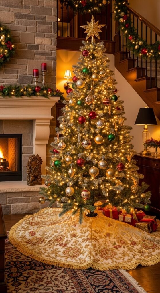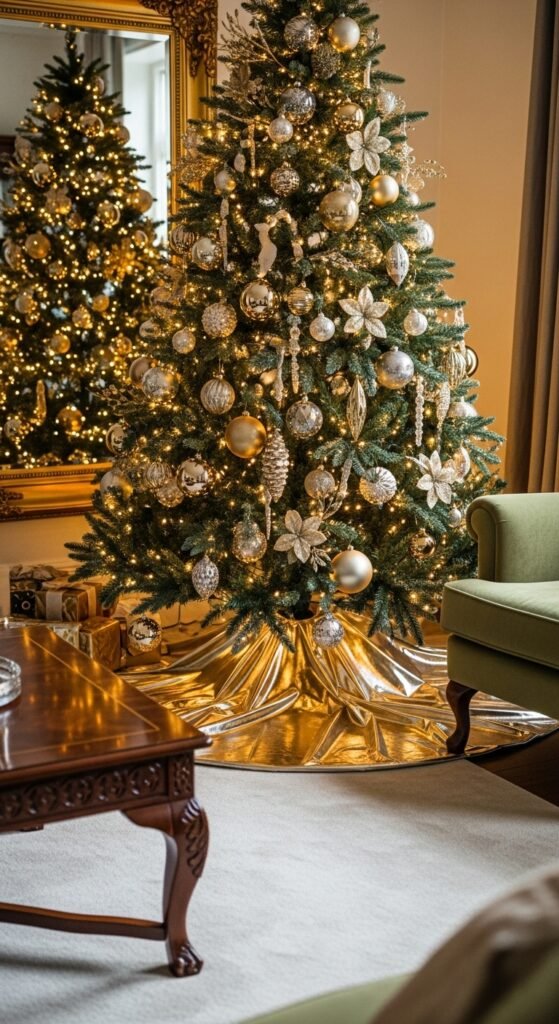 A gold skirt adds a touch of shine to your holiday display. The reflective surface catches the lights beautifully, creating a soft glow around the tree base. This style works well in glam or modern homes. Choose a pleated, satin, or metallic fabric depending on how much shine you prefer. Pair it with white or gold ornaments for a unified look. You can also add a velvet ribbon border for dimension. Wrap gifts in glossy white or metallic paper for harmony. This style brings a radiant mood to your tree area without feeling too heavy.
