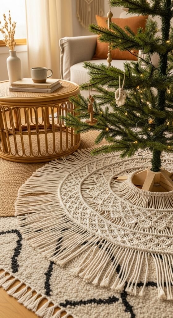 Macramé skirts add texture and artistry to your holiday corner. The knotted patterns look beautiful against wood floors or patterned rugs. If you enjoy crafting, you can create one using cotton cord and a simple knotting guide. This style pairs well with wooden beads, feather ornaments, or natural garlands. Keep the tree simple so the skirt can shine. Add neutral-wrapped gifts for balance. The fringe creates soft movement and keeps the area relaxed. The handcrafted look works wonderfully in boho, eclectic, or natural holiday themes.