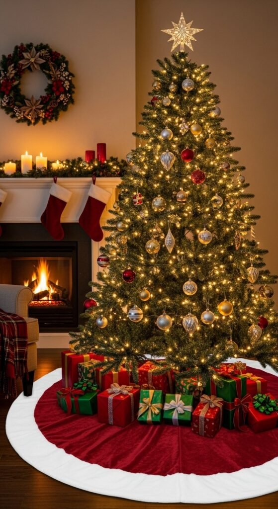 Tulle adds a dreamy, airy look around the base of your tree. The soft mesh layers resemble snowdrifts in the right lighting. You can use multiple layers of tulle to get more volume. Pair it with delicate ornaments—pearls, white baubles, and clear icicles look especially pretty. This style works well in bright rooms with soft palettes. If you want a DIY option, gather wide strips of tulle and stitch them onto a circular base. Gifts wrapped in soft colors will blend beautifully. The skirt creates a gentle winter look that feels magical without overwhelming the space.