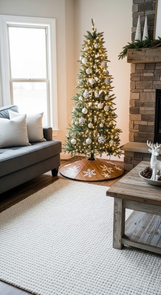 A wooden round offers a sturdy base with a unique charm. It’s great if you prefer a clean, structured look. You can paint snowflakes, stars, or holiday messages on the surface using stencils. Stained wood blends beautifully with rustic or modern homes. This faux skirt also makes cleanup easier since needles can be swept directly off. Pair it with natural ornaments or kraft-wrapped presents. The solid base helps your tree area feel grounded while adding a custom touch.