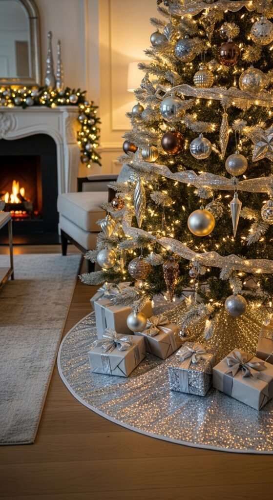 Sequins add pure sparkle to your holiday setup. When the lights hit, the entire base shines like a soft disco effect. This style works perfectly in glam or modern homes. Choose silver, gold, or champagne depending on your palette. You can also layer it over a solid fabric for depth. Keep ornaments glossy and dramatic to match the mood. Gifts wrapped in metallic paper blend beautifully. This skirt brings a touch of Hollywood holiday flair to your room.