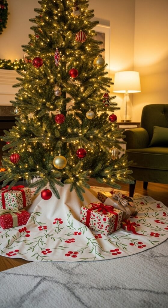 A chunky knit skirt adds a warm, inviting layer under your tree. The thick yarn gives it a soft, sculpted texture that stands out even when gifts fill the space. It works beautifully in neutral living rooms or Scandinavian-style corners where calming tones shine. If you’re handy with yarn, try creating one using oversized needles and wool roving for a handmade touch. Faux-wool options are great if you want something lighter and easier to store. Keep the skirt slightly lifted on one side to show off its texture. This style works well with matte ornaments like brushed gold, champagne, or white baubles. Add a few wrapped boxes in craft paper for harmony. The soft texture instantly grounds your tree without pulling attention away from the ornaments. It’s simple, pretty, and perfect for anyone who prefers a warm, quiet holiday corner.