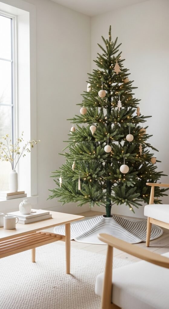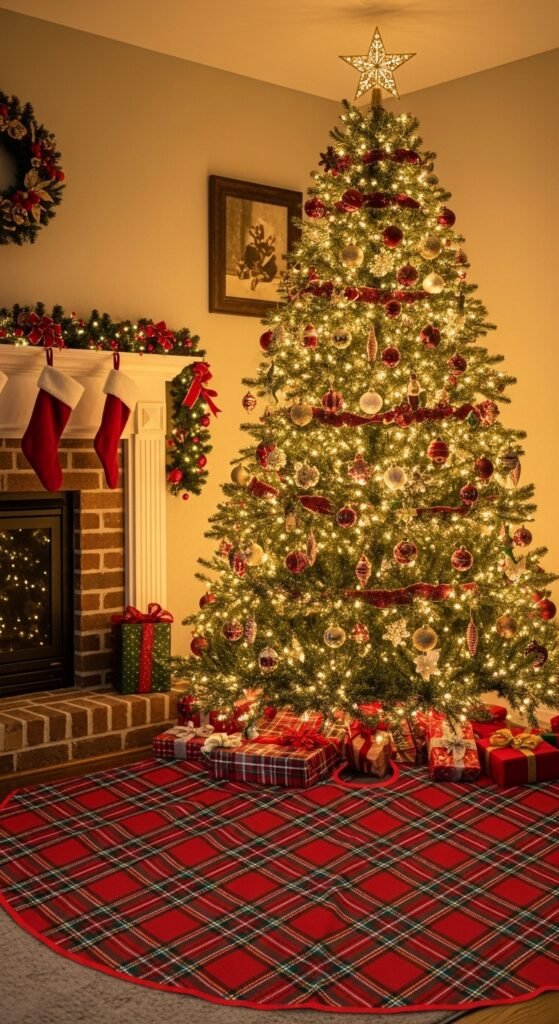 A tartan skirt instantly brings color and festive charm to your living room. The classic pattern works beautifully in traditional spaces or rustic cabins. Choose a thick cotton or flannel version so it drapes cleanly. You can sew your own by cutting a circle and adding a felt lining for structure. Plaid pairs well with bright red ribbons, pine cones, and mixed metallic ornaments. Keep wrapping paper simple—solid red or green makes everything feel polished. The bold lines of tartan create a nostalgic holiday scene and anchor the tree visually. It’s timeless, cheerful, and full of character.