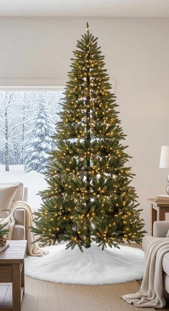 Faux fur brings a soft winter mood to your tree. Its silky texture reflects the lights, giving a snowy glow at the base of your branches. Place it under a slim or full tree—both look equally charming with the plush surface. If you want extra fullness, layer two skirts for a deeper pile. This style pairs nicely with silver ornaments, glass icicles, and cool palettes. You can also tuft the skirt slightly for drama. When the lights hit, the whole base appears to shimmer softly. Faux fur is surprisingly easy to maintain—just shake out pine needles every few days. Add a few white-wrapped presents for harmony. The look is luxurious without feeling heavy, making it great for modern, glam, or even minimalist homes.