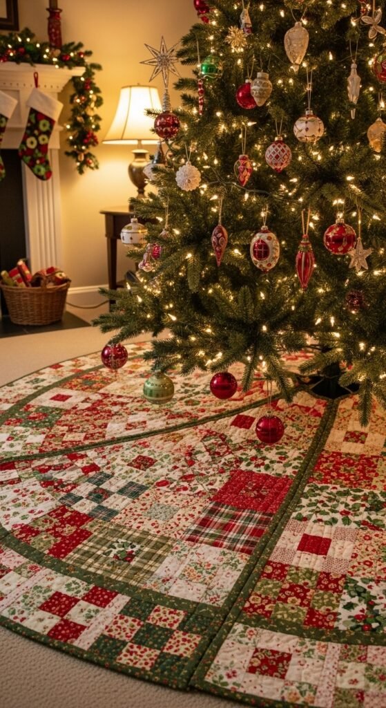 A quilted patchwork skirt feels nostalgic and handmade. Every fabric square adds character, whether floral, plaid, or holiday-themed. It works well if you love a cheerful, layered holiday look. You can sew one using leftover fabric scraps or repurpose shirts and old linens for meaning. Add batting for a fuller shape and stitch simple patterns to keep everything secure. This style looks wonderful with classic ornaments—think red ribbons, candy canes, and tiny felt shapes. If you want balance, wrap gifts in solid colors so the skirt can shine. The quilted surface brings cozy personality to your tree and instantly warms the room.
