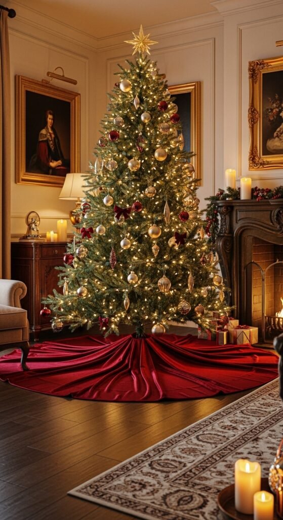 A velvet skirt adds drama without feeling overwhelming. The fabric catches light beautifully, creating gentle shadows and folds. It works perfectly in classic holiday spaces, especially those with gold or brass accents. If you want to give it extra definition, choose a skirt with gold piping or a scalloped edge. Velvet is also easy to drape, so play with how it falls around the tree stand. Keep your ornaments simple—gold, clear, or matte red blend well. For a DIY option, cut velvet into a circle and add felt backing for structure. Place a few metallic gift boxes around the base for shine. This choice gives your tree a rich, timeless look from every angle.